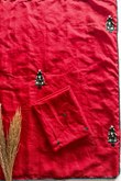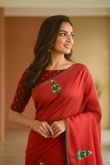A drop-from-heaven kind of saree, with a burgundy shade over industrial kota fabric with exquisit Handwork embroidery brings out the most elegant look