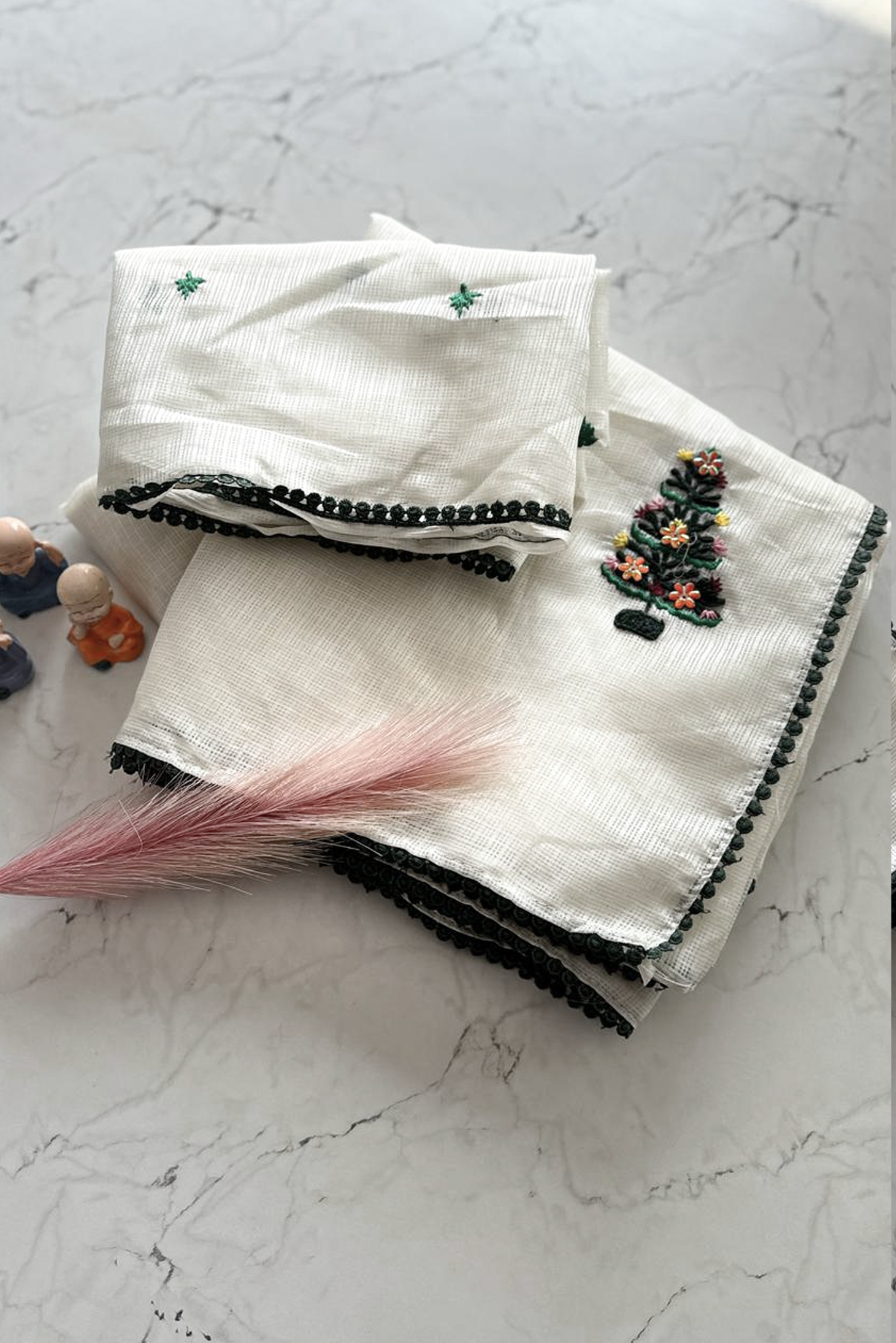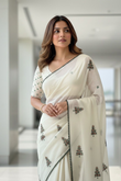 Elevate your festive wardrobe with this elegant Ivory Hand-Embroidered Christmas Tree Saree, crafted to add a soft, graceful glow to your celebrations. Designed in a soothing ivory shade, this saree features delicate tree motifs embroidered with multicolour threadwork, giving it a unique holiday-inspired charm.