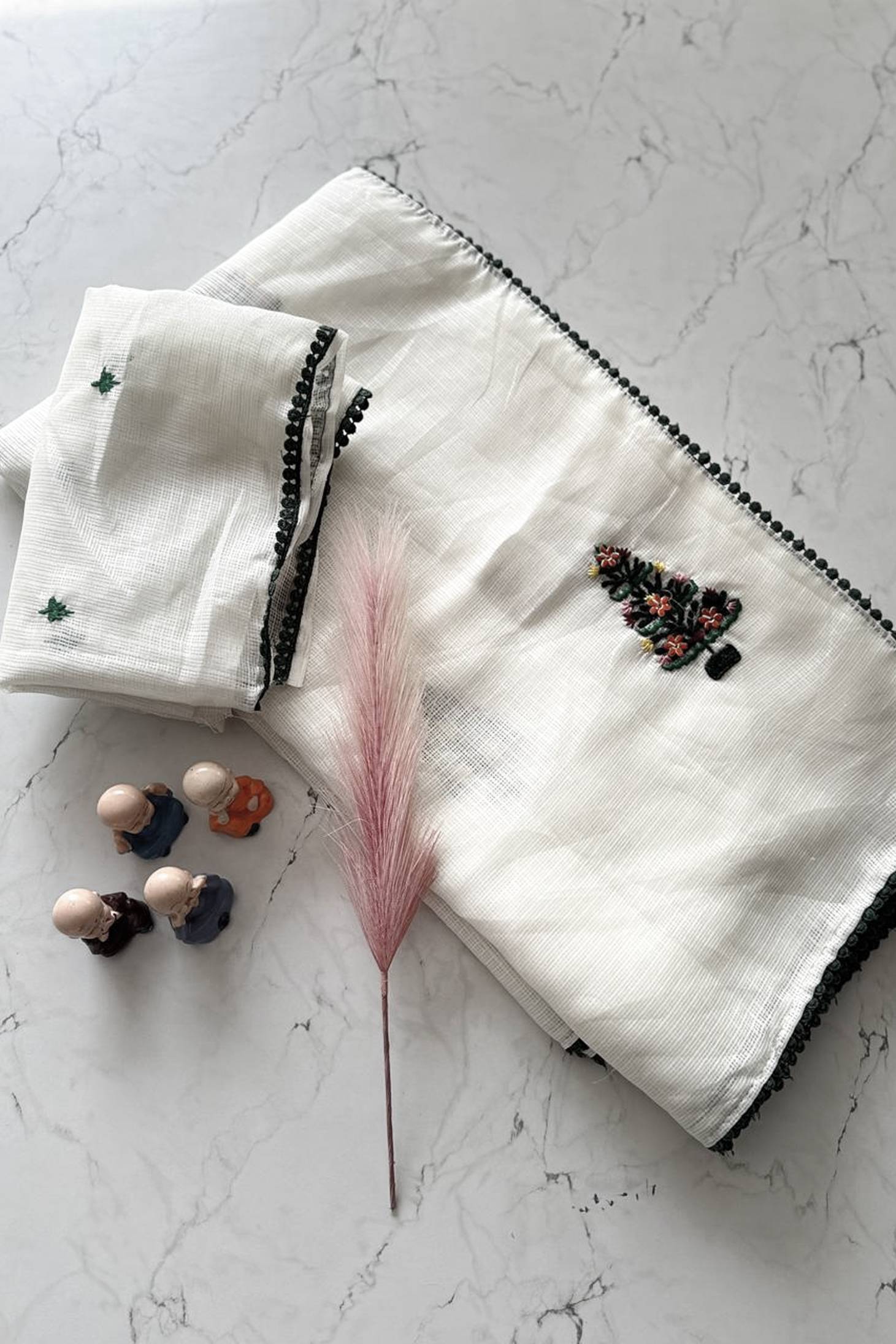 The lightweight, breathable fabric drapes beautifully, making it perfect for long events and festive gatherings. The saree is finished with a contrasting scallop-style green border that enhances its refined look. Paired with a matching blouse featuring minimal embroidered motifs, this set blends simplicity with sophistication.