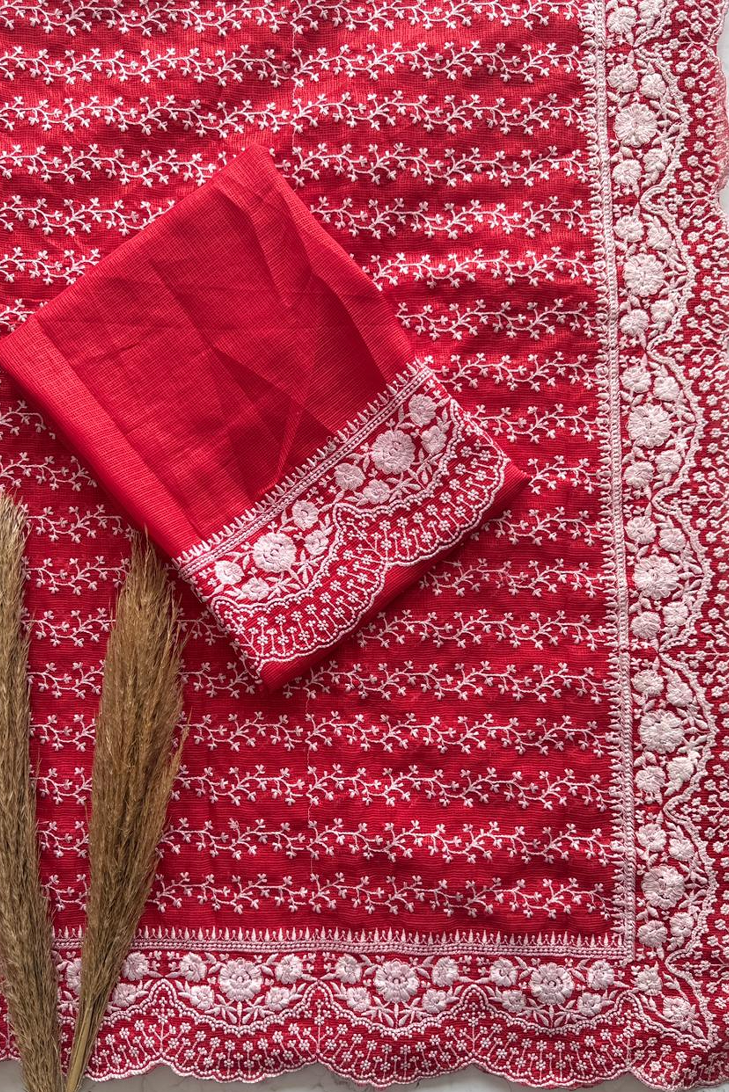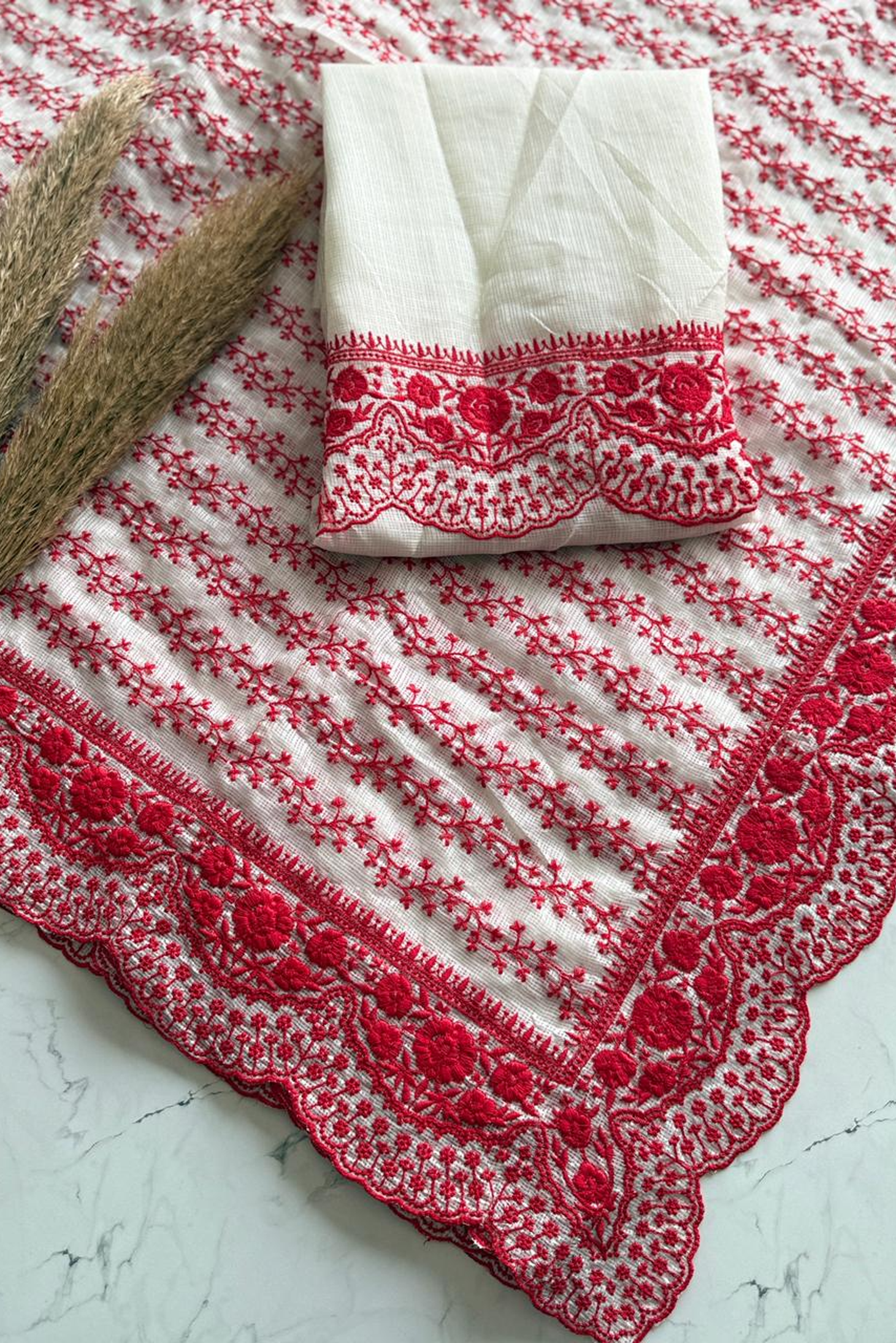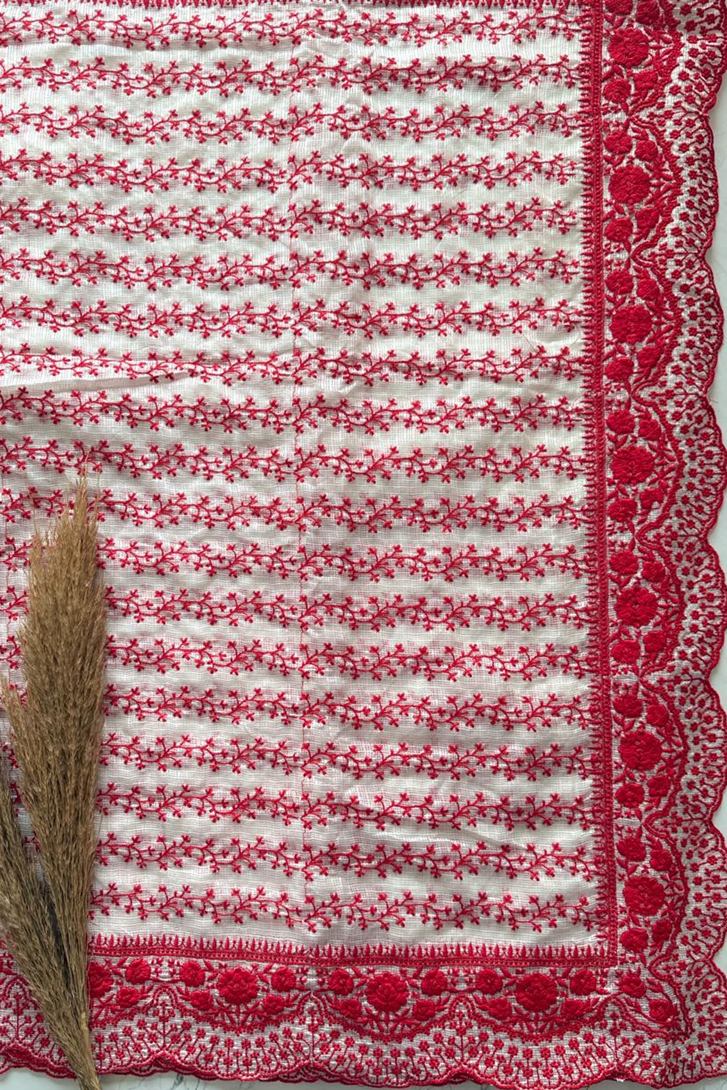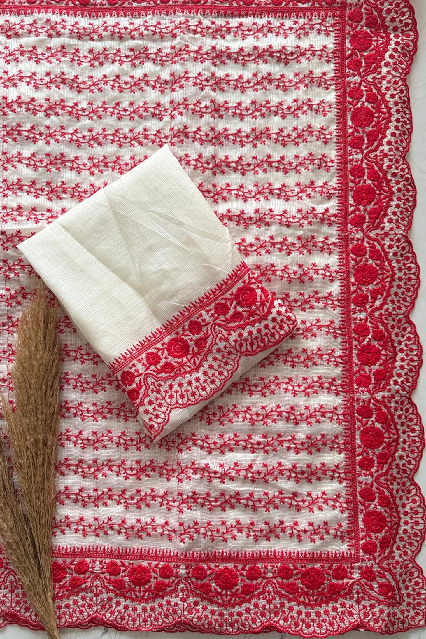 Experience timeless elegance with our Red & White Contrast Embroidered Saree, crafted to bring together tradition and modern grace. This saree features a beautiful white base enhanced with rich red thread embroidery, showcasing delicate floral vines and a stunning intricately designed scallop border.