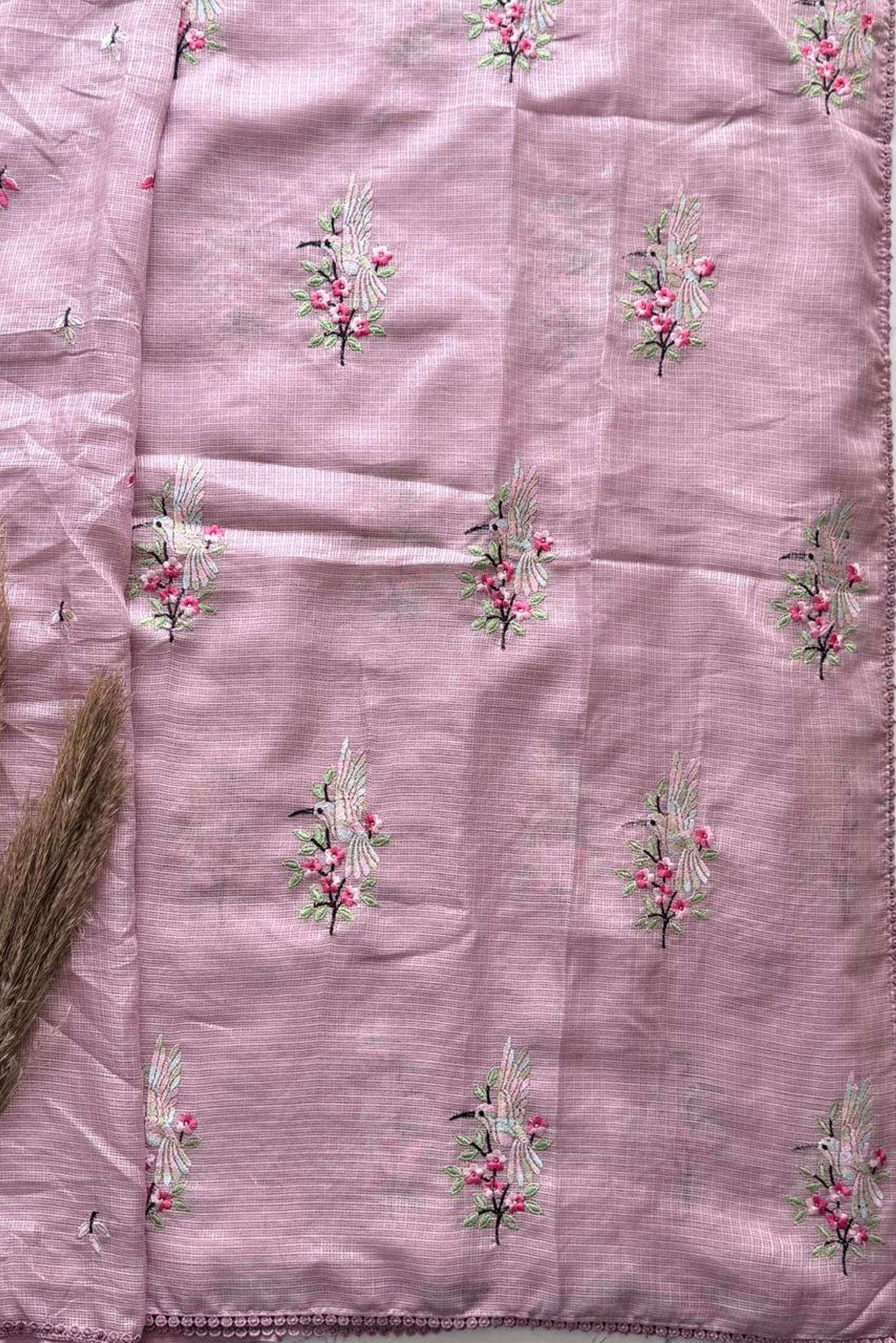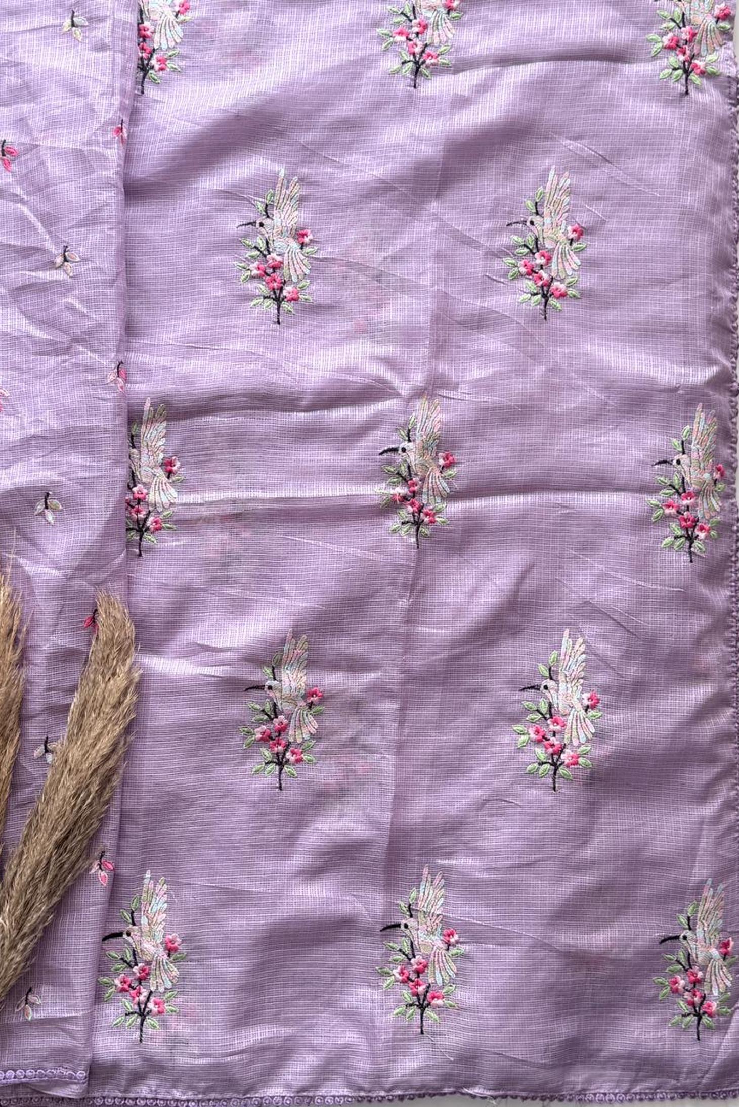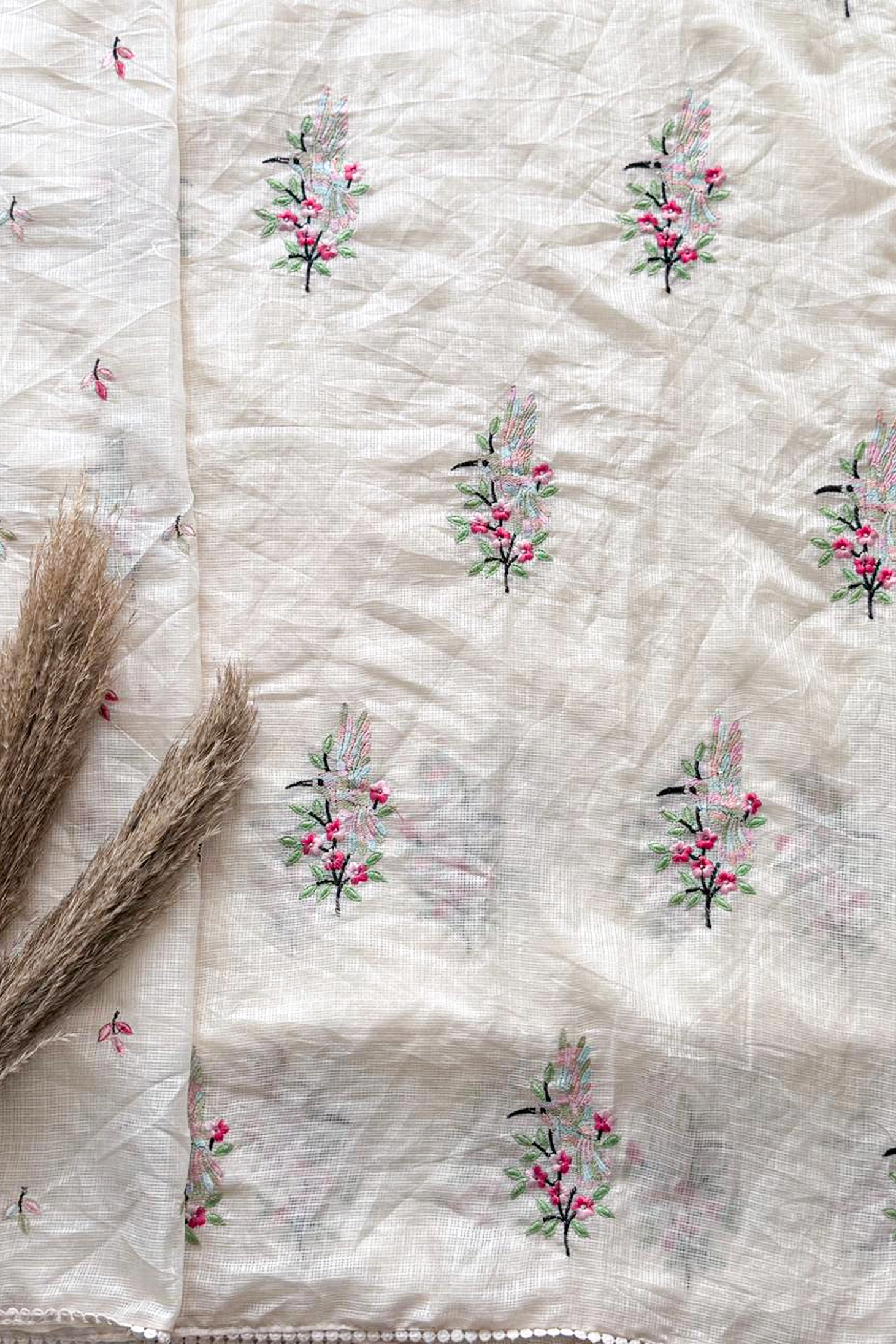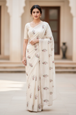 Indulge in the delicate artistry of our 'Hummingbird Garden' Saree, a piece where classic texture meets intricate, vibrant hand embroidery. This saree is perfect for day events, festive gatherings, or simply adding a touch of sophisticated charm to your everyday wardrobe. Elevate your ethnic wardrobe with this exquisite saree, crafted for elegance and style. Available in four stunning colors, this saree blends traditional charm with contemporary sophistication. Made from premium fabric, it drapes beautifully, offering comfort and grace all day long. The intricate embroidery and delicate patterns enhance its luxurious appeal, making it perfect for weddings, festivals, or special occasions. Pair it with your favorite blouse and accessories to create a timeless look.