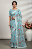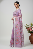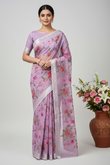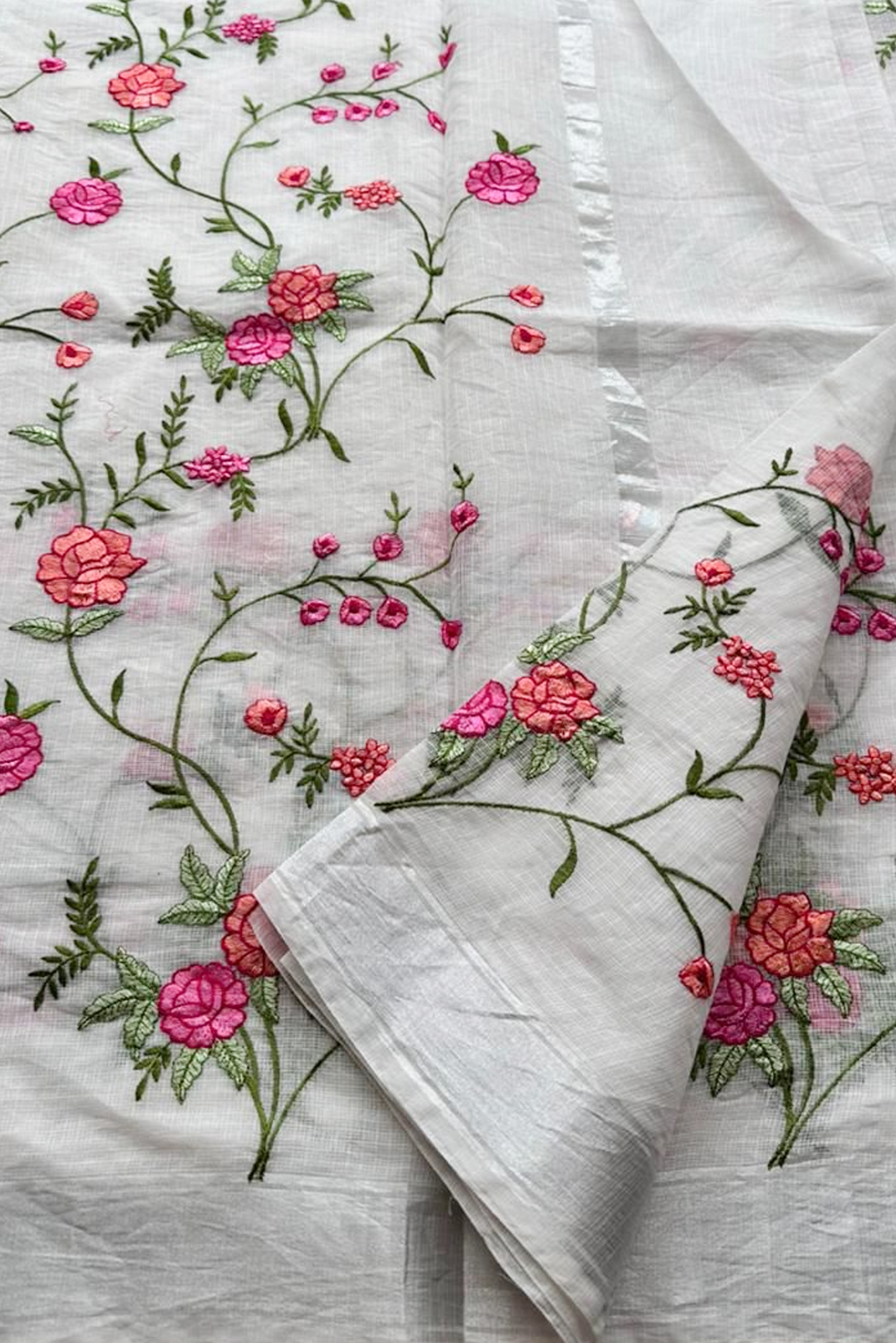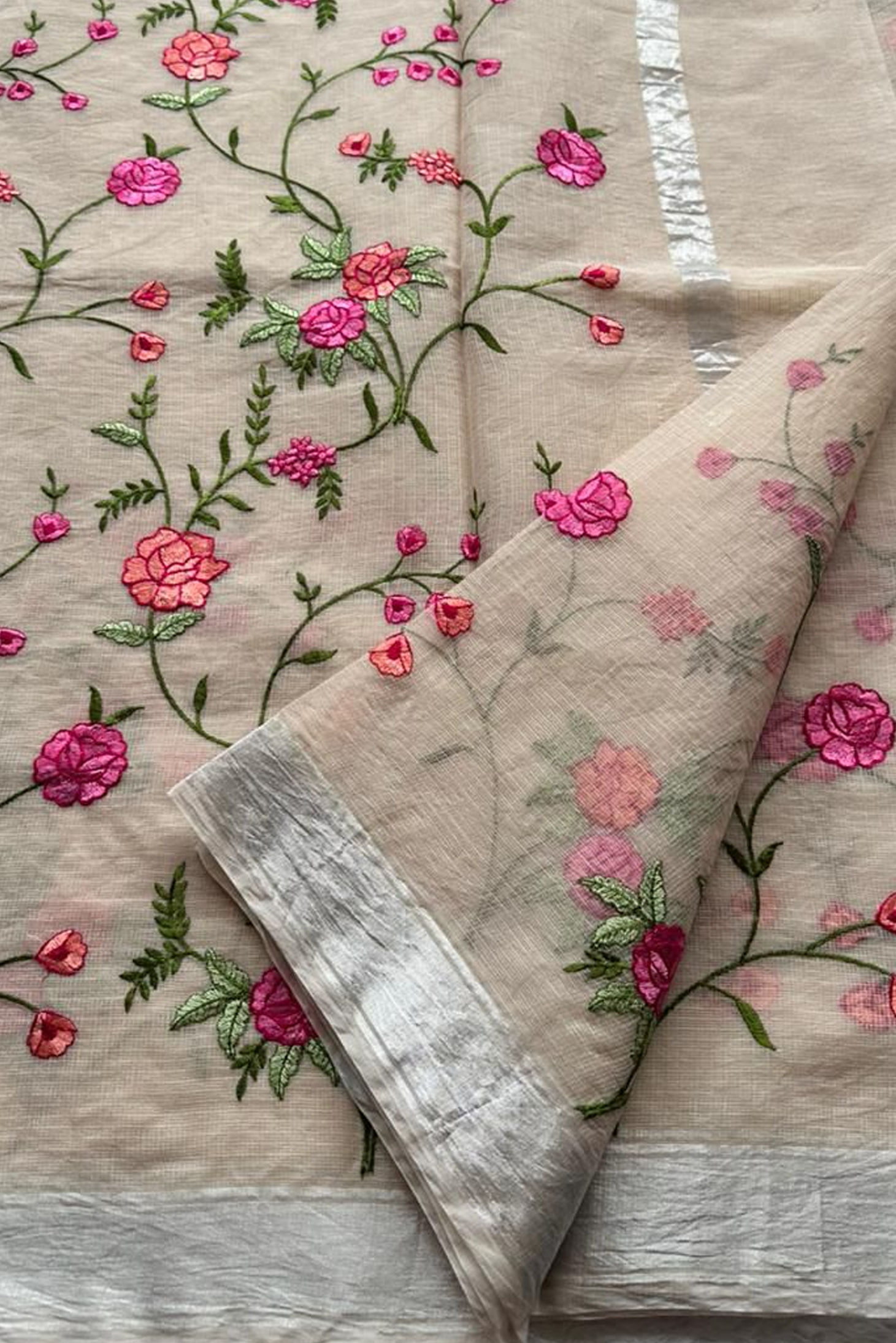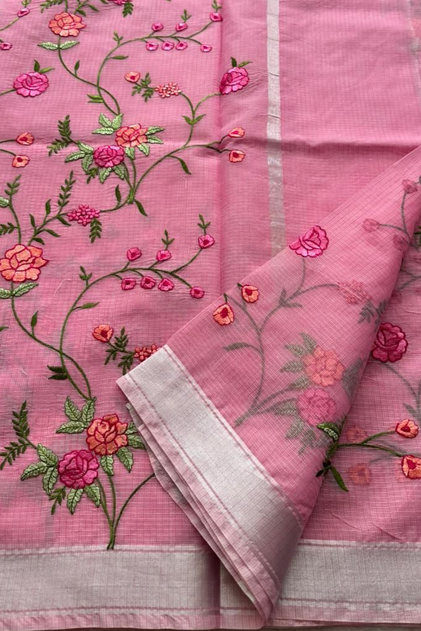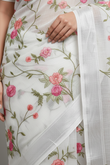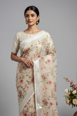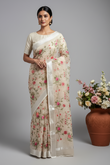 Hand-Embroidered Ivory Kota Doria Saree with Pink Rose Motifs