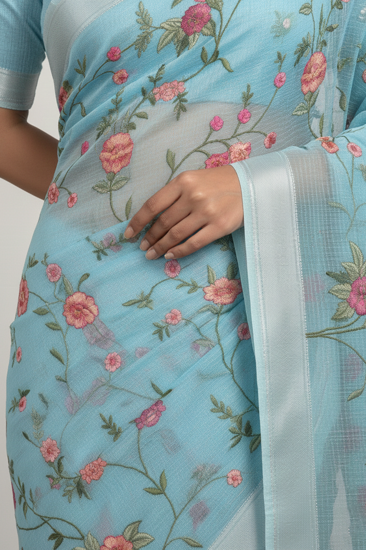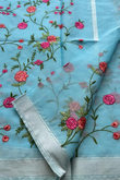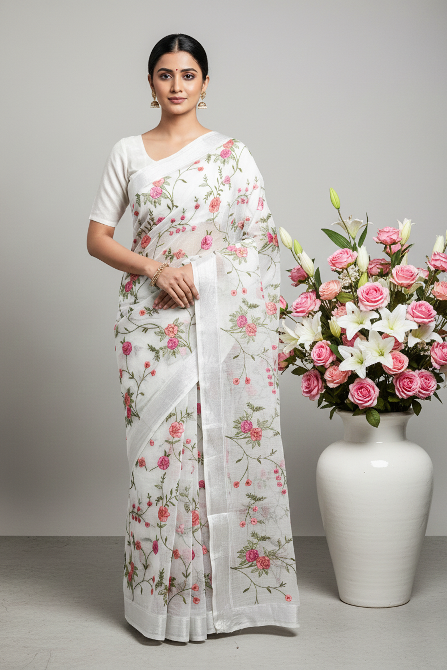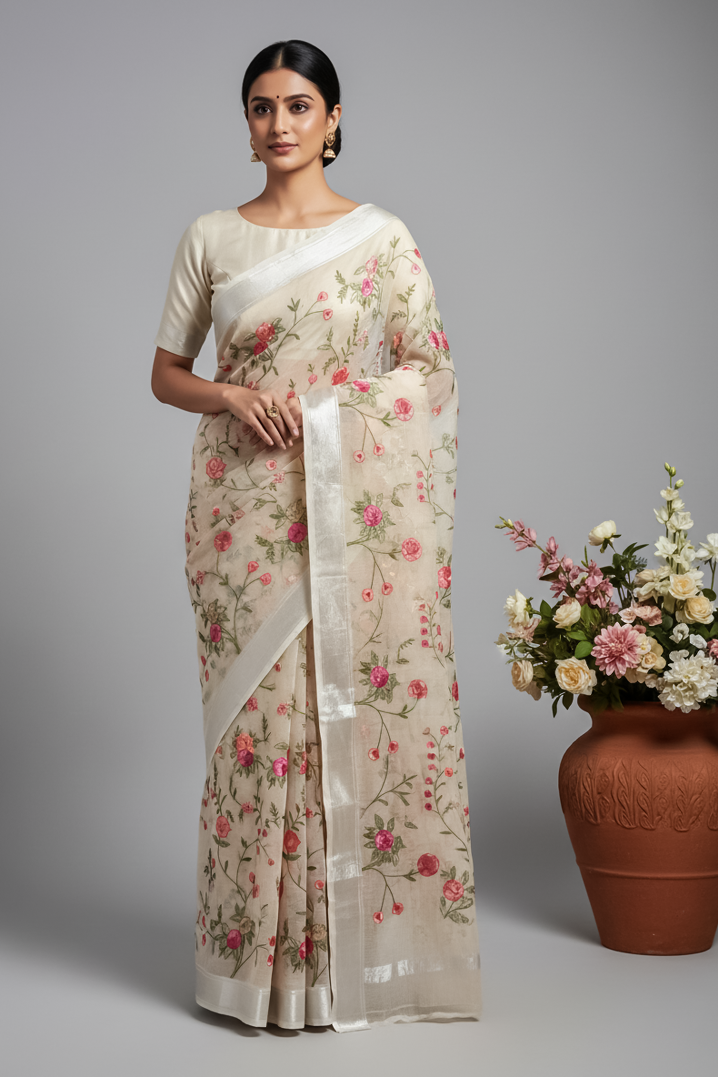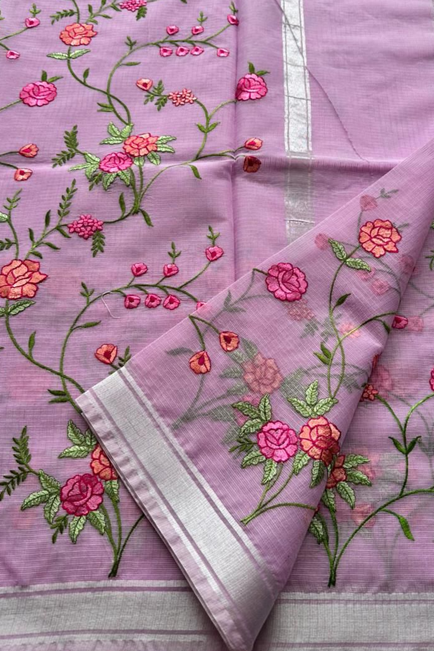 Elevate your ethnic wardrobe with this elegant ivory Kota Doria saree, beautifully adorned with vibrant pink and peach floral embroidery. Crafted with fine detailing, the saree features intricate threadwork vines and blooming rose motifs, giving it a fresh, graceful, and feminine appeal.