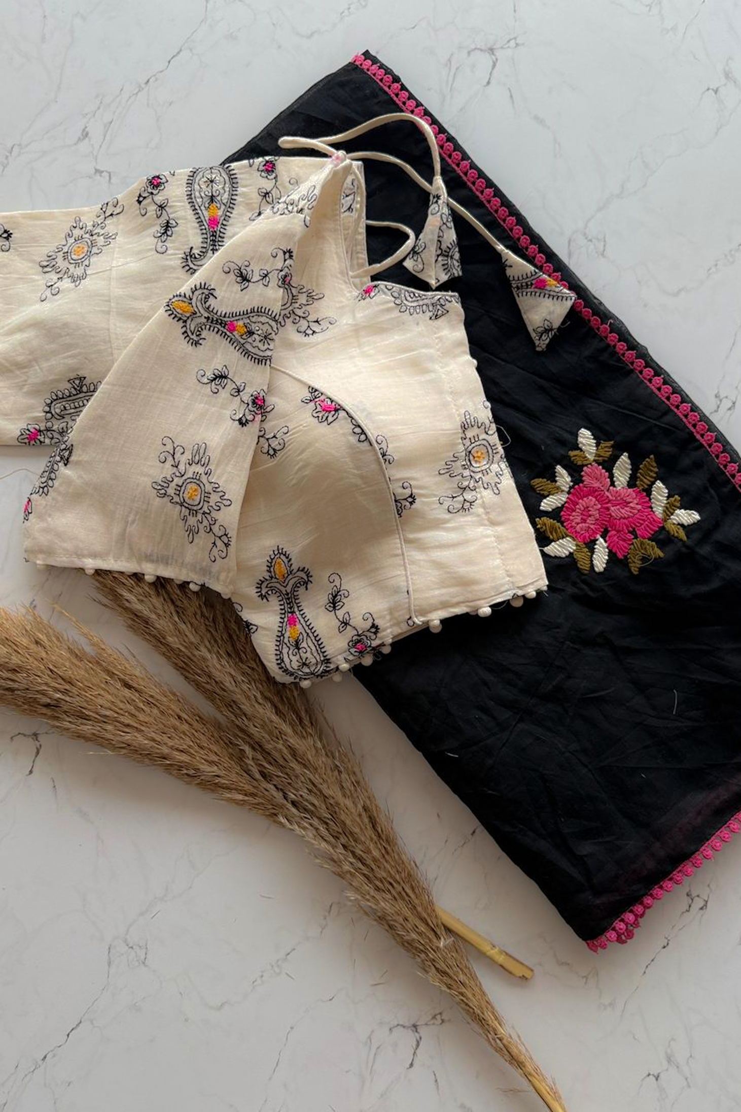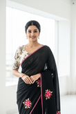 The Embroidery: The saree is beautifully accented with intricate, hand-crafted floral embroidery in a vibrant hot pink shade. These delicate floral motifs are strategically placed along the border and pallu, creating a striking contrast against the black canvas.