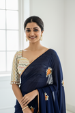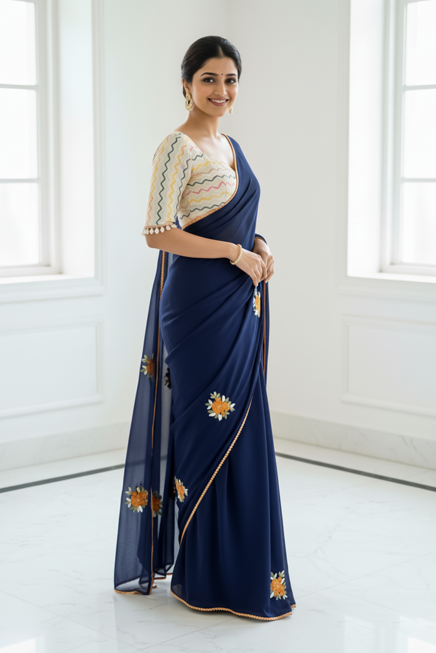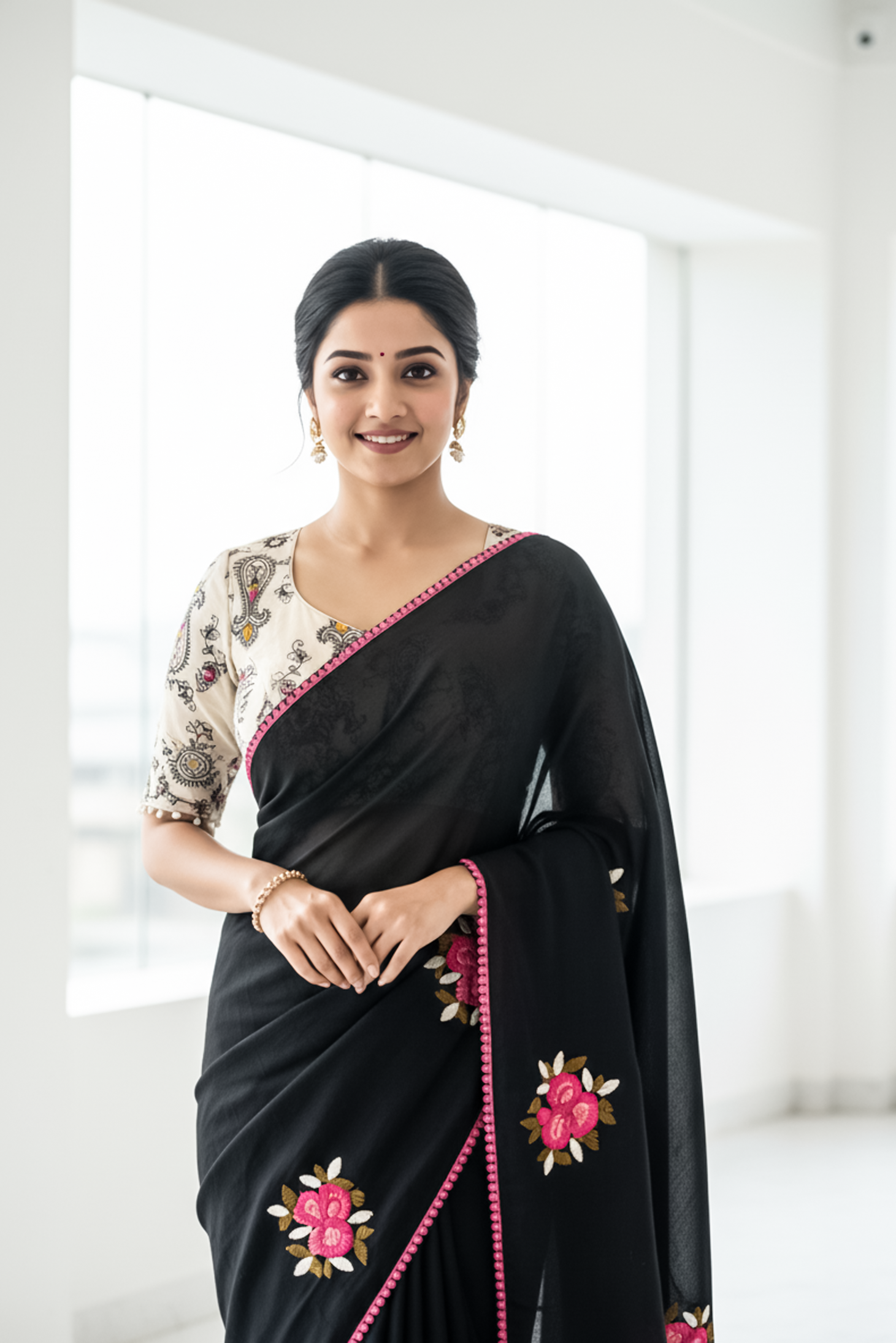 Saree Fabric & Color: Luxurious, lightweight black Georgette or Chiffon that drapes effortlessly and maintains a sleek silhouette.