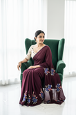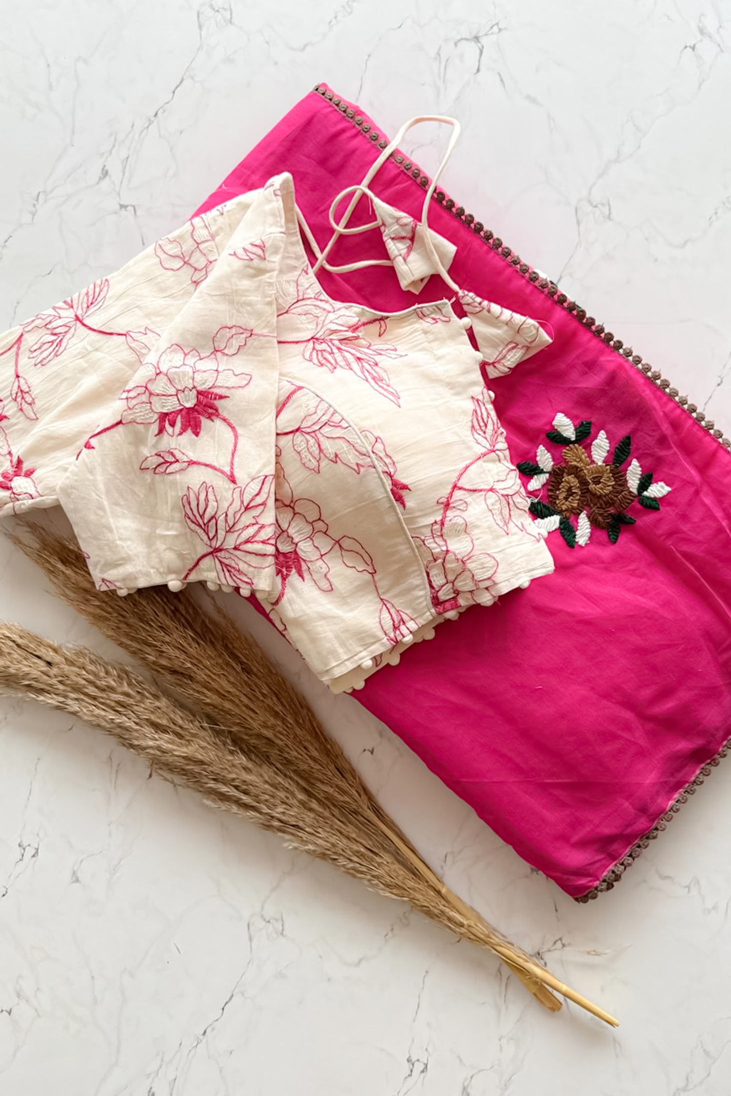 The Border: The prominent feature is the extremely dense and detailed floral border running along the length of the saree.