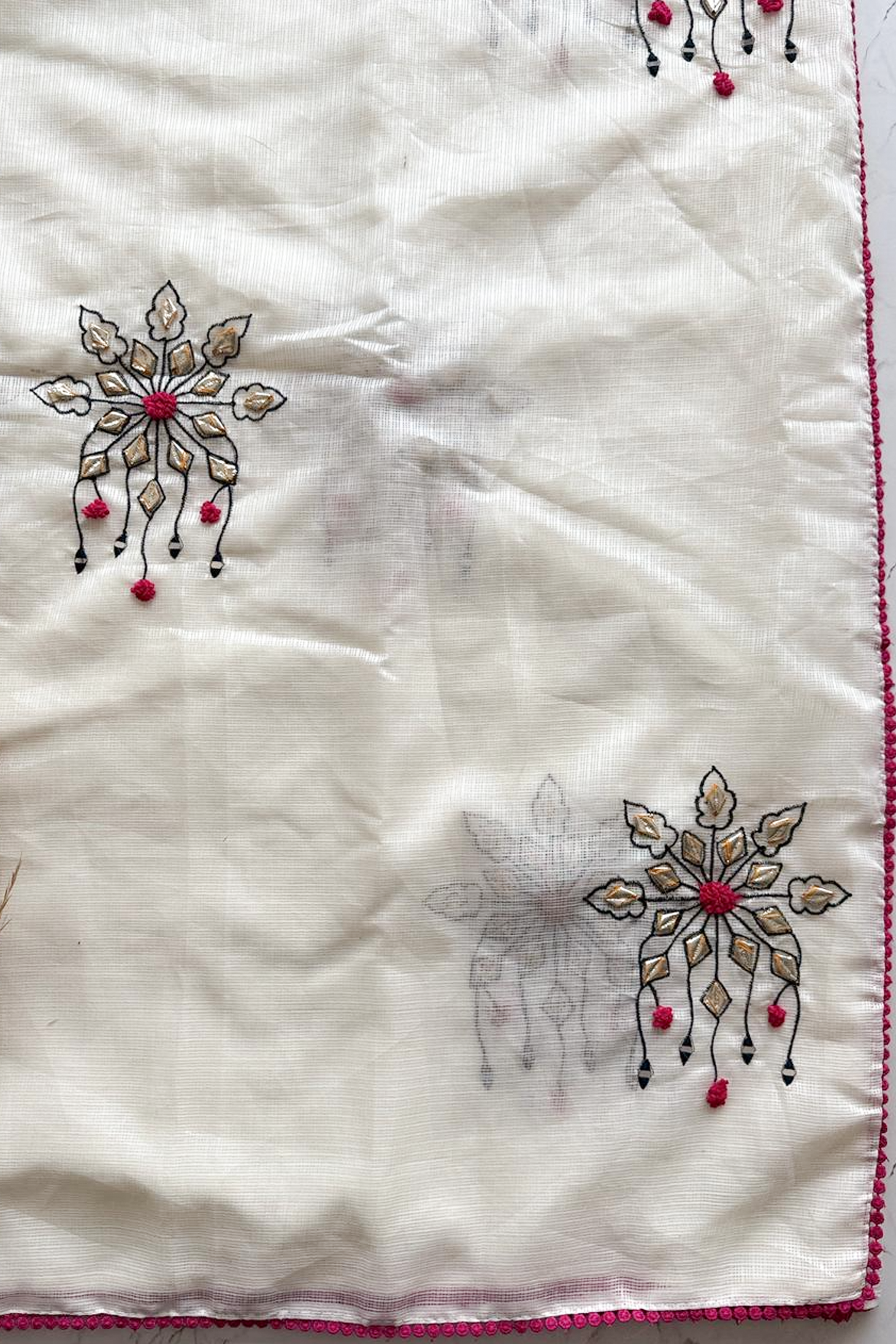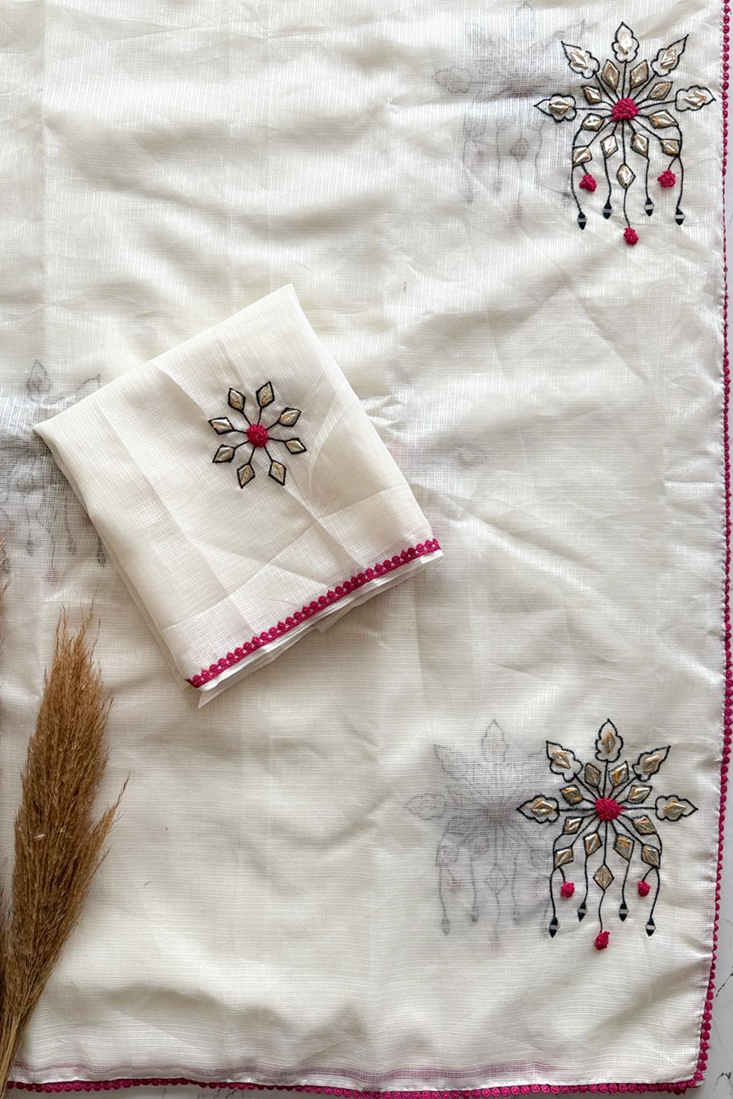 Whisper White Kota Doria Saree with Pop-Pink Trim Handwork saree